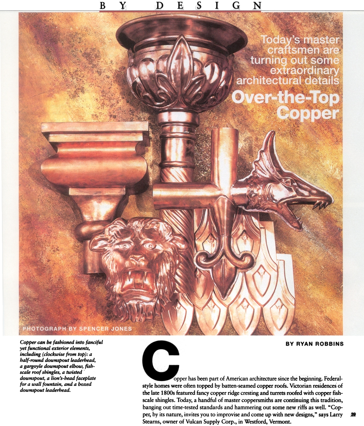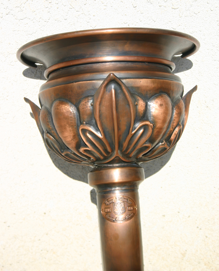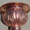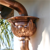An original design by Hans, crafted from heavy 32 oz (16 ga. or .0431) copper. The leader head includes gracious elements of classical architecture. This masterpiece of coppersmithing is completely hand-made. The quality will exceed your expectations. The beautiful leader head was also shown in THIS OLD HOUSE magazine. The pedals or flutes are chased out from the body, not pressed or stamped. All welded construction, it will last for centuries to come.